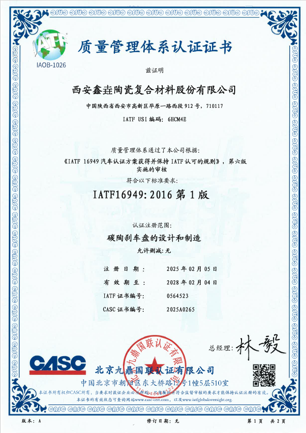 近日,西安鑫垚陶瓷復合材料股份有限公司收到了北京九鼎國聯(lián)認證有限公司下發(fā)的IATF 16949汽車質(zhì)量管理體系認證證書,認證注冊范圍為“碳陶...